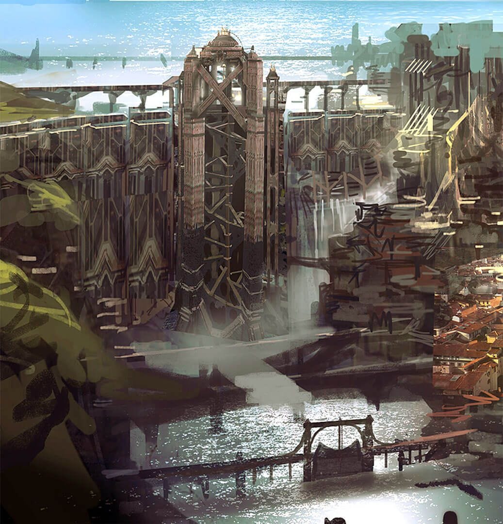 Se trata de una pared industrial que cae hasta la Fosa de Zaun, donde los residuos de las tuberías caen en forma de cascadas. En su extremo superior están las puertas del Sol (Sun Gates). Fueron el epicentro de la catástrofe que hundió Zaun. Como tal, lo he construido a las puertas del canal que separa las dos partes de la ciudad, al suroeste.