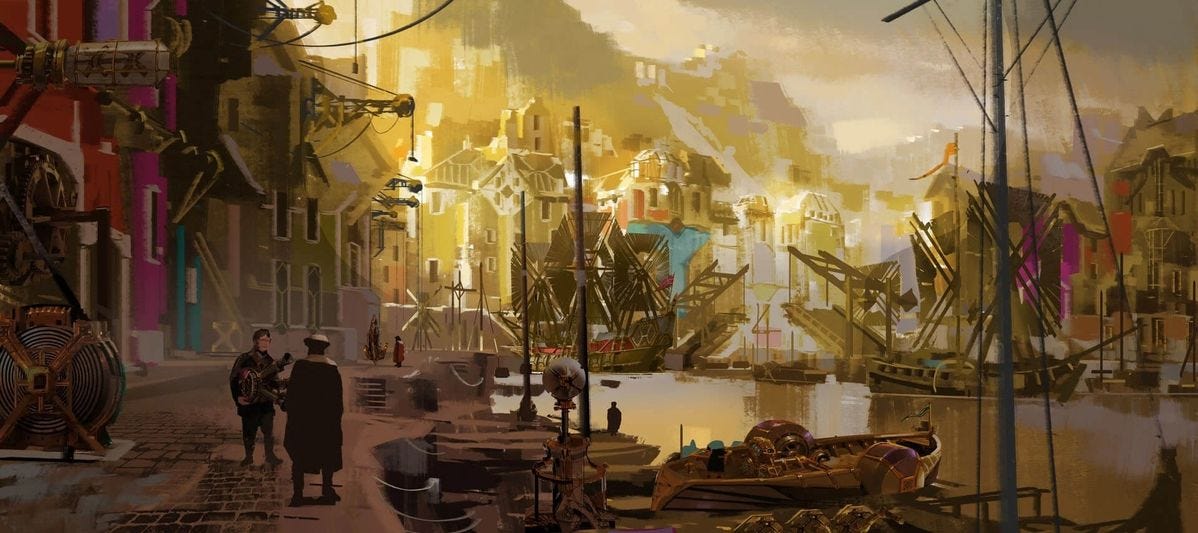 Los muelles se mencionan en LoL y aparecen brevemente en la serie a la llegada de Ambessa y su ejército a Piltover. No se especifica su ubicación exacta, pero me ha parecido razonable ubicarlos al oeste por tres motivos: i) acceso eficiente a Stillwater Hold, que sólo es accesible en barco, ii) separarla de los Hexgates, para no recibir todas las llegadas en el mismo punto, y iii) para separarla de la zona alta, donde no suelen situarse puertos comerciales.