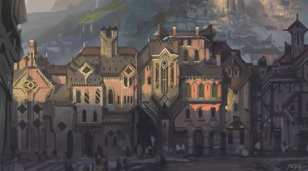 Esta zona en LoL es un área residencial al norte de la ciudad, donde Jayce y Heimerdinger tienen sus talleres. Además, hay cafés, restaurantes y teatros. Por lógica de Arcane, debería estar al otro lado del Puente del Progreso, pero la he acercado a las Fisuras para facilitar el comercio con Zaun (y el golpe de Vi al inicio de la serie). Ya que incluye la famosa Sidereal Avenue, he dejado este distrito para ocio, mercaderes y talleres. Viendo cómo acaban los experimentos en la serie, veo razonable que la clase más alta resida en una zona alejada de ésta.