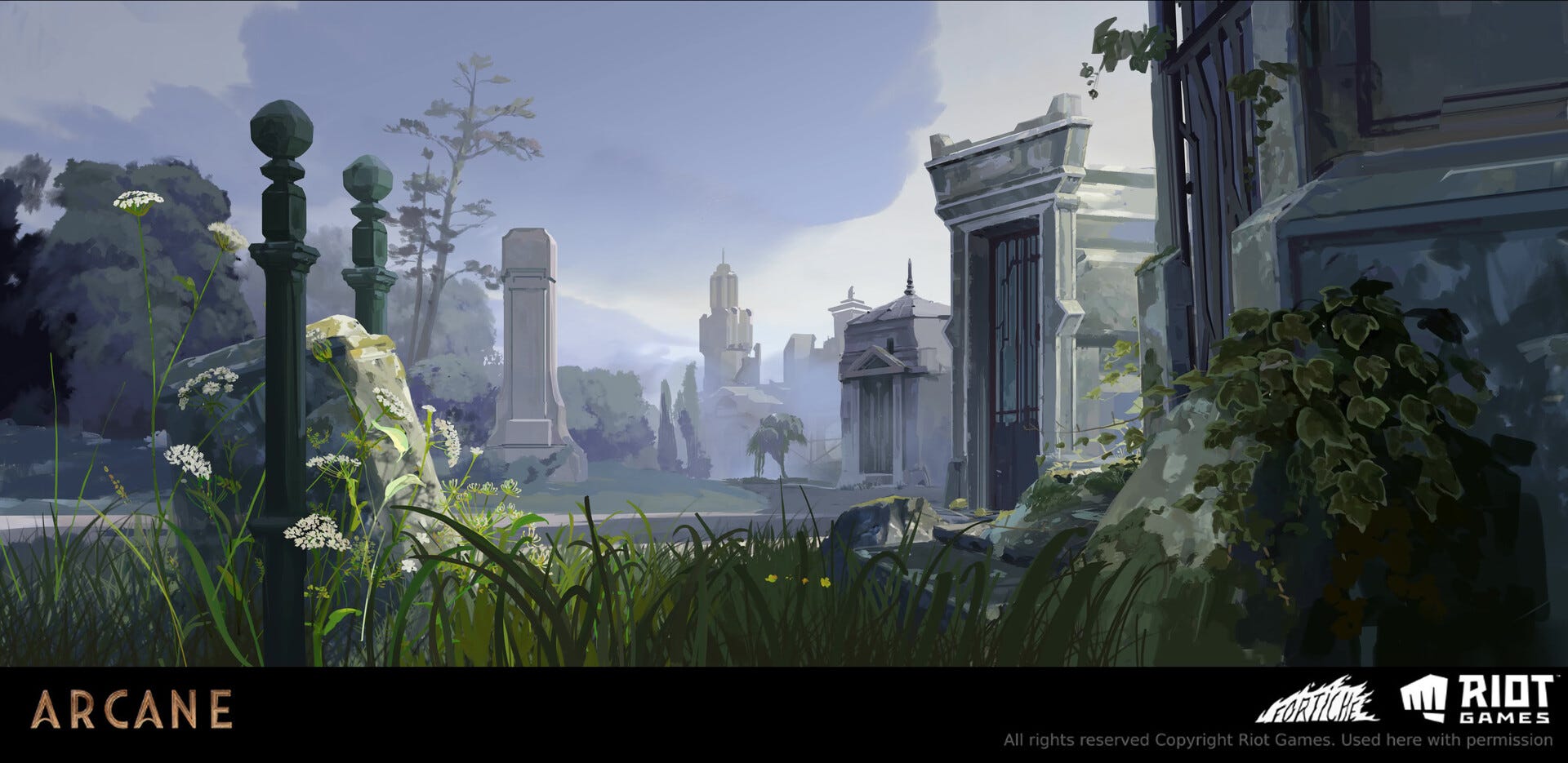 El cementerio aparece en varias ocasiones a lo largo de la serie. He decidido su ubicación siguiendo patrones urbanos típicos, en una zona elevada y respetable de la ciudad, pero separada de la misma. Por la propia estructura del mapa lo he situado en la zona boscosa al este de New Piltover.
