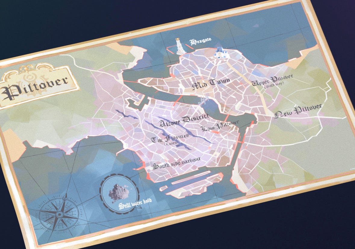 El mapa de Caitlyn en Arcane muestra la división canónica de la ciudad en distritos, separados por el río Pilt y comunicados por puentes, de los cuales el más conocido es el Puente del Progreso, donde arranca la serie. Al oeste del río Pilt aparecen South Side Harbour, las Fisuras, Low Piltover y Alcove District, mientras que al este, más rico, aparece Midtown, Upper Piltover y New Piltover, junto con los Hexgates.